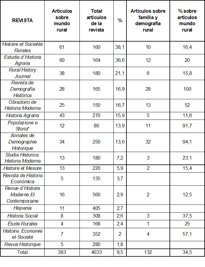Para el segundo objetivo se han analizado de forma detallada e individualizada los artículos en cuya cronología figuraran -en todo o en parte- los siglos XVI, XVII y XVIII, y que hubieran sido publicados entre el año 2000 y 2014 en revistas europeas especializadas, fundamentalmente, en historia rural y demografía histórica. Para ello se han seleccionado, en el primer caso, cinco publicaciones periódicas: Histoire et Societés Rurales; Études Rurales; Historia Agraria; Estudis d´Historia Agraria; y Rural History. Society, Economy and Culture. Y en segundo lugar tres: Annales de Demographie Historique, Revista de Demografía Histórica y Popolazione e Storia. Junto a ellas se han utilizado otras nueve revistas de historia, pero más generalistas, editadas en dos países, Francia y España, con larga tradición en investigación sobre historia rural. Entre las revistas galas se seleccionaron cuatro: Revue d´Histoire Moderne et Contemporaine; Histoire et Mesure; Revue Historique; e Histoire, Economie et Societé. Y entre las españolas cinco: Obradoiro de Historia Moderna; Studia Historica. Historia Moderna; Hispania; Historia Social; y Revista de Historia Económica. El criterio seguido para la selección de este tipo de publicaciones más generalistas fue que se tratara de revistas que aceptasen trabajos de historia social, económica o relacionada con la población y que, además, ocuparan posiciones importantes en bases de datos de prestigio como SCOPUS. En conjunto, se han consultado y vaciado 17 revistas con un total de 4033 artículos, de los que 383 se refieren al mundo rural; y de ellos, 132 al objeto de nuestra investigación (Cuadro 1 del Anexo).