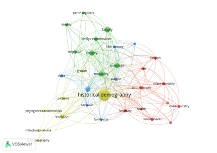 Figura 1. Red de co-ocurrencias de palabras clave de los artículos sobre demografía histórica y familia en WoS (2000-2019)