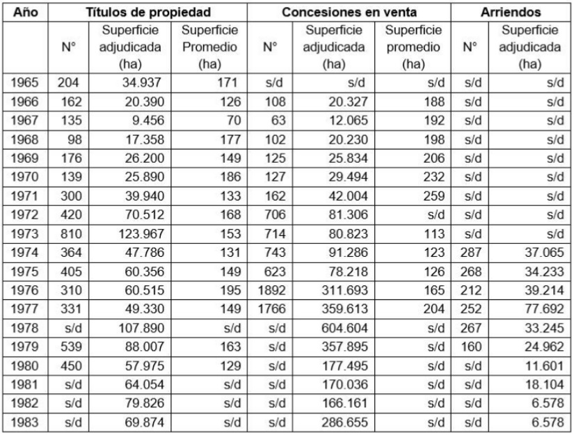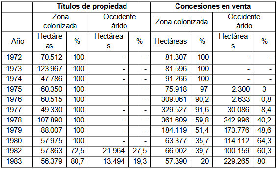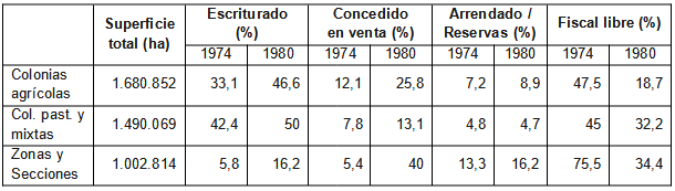 El cambio que la creación del Instituto de Colonización representó para la privatización de tierras fiscales resultó evidente de inmediato. Entre 1965 y 1971 la Dirección de Tierras provincial había otorgado en propiedad unas 25.000 ha anuales como promedio y concedido en venta una extensión similar. En los primeros años de funcionamiento del Instituto, entre 1972 y 1975, la superficie privatizada por año creció a una media cercana a las 76.000 ha, mientras que la concedida llegaba a unas 83.000 ha. Durante el período de 1976 a 1983 se aceleró aún más este proceso. En ese lapso, el promedio anual de la superficie otorgada en propiedad, alrededor de 72.000 ha, fue similar al de años anteriores, dado que la entrega de títulos avanzaba a medida que los adjudicatarios cumplían sus obligaciones. En contraste, las concesiones en venta, que resultaban de la actividad administrativa del Instituto, crecieron a una media anual de 300.000 ha. Hasta 1978 el otorgamiento del suelo se concentró en el área colonizada, pero a medida que se completaba este proceso las adjudicaciones se desplazaron a la región recién incorporada del oeste.