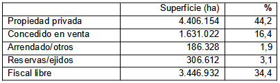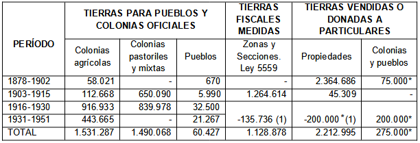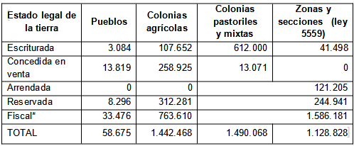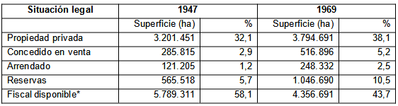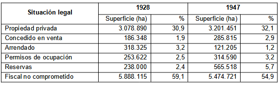 En 1947, el área de dominio privado o concedida en venta representaba el 35 % de la superficie total del Territorio, una proporción apenas 2,2 % superior a la de 1928, cuando el avance colonizador recién comenzaba su fase más dinámica. En el lapso comprendido entre esos años, el promedio anual de superficie titularizada fue de sólo 6.450 ha. De esta forma, más de la mitad de las tierras eran fiscales desde el punto de vista legal. En las colonias agrícolas, las tierras enajenadas o concedidas hacia 1947 representaban poco más del 25 % de la superficie total, pese a que los lotes explotables estaban en su mayor parte poblados. En las colonias pastoriles, mixtas, zonas y secciones, las tierras privatizadas representaban en conjunto cerca del 27 %.