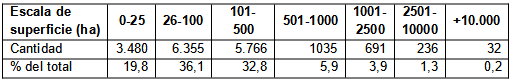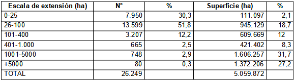 Hacia 1960, alrededor del 30 % de los predios tenía una superficie que no superaba las 25 ha. Dentro de este grupo, las unidades de hasta cinco hectáreas pertenecían por lo común a trabajadores rurales. En las explotaciones que superaban ese umbral, generalmente el ingreso principal provenía del cultivo algodonero pero debido a la escasa superficie, la producción apenas garantizaba la subsistencia. En el estrato de 26 a 100 ha se encontraban las explotaciones familiares pequeñas y medianas. Este grupo, resultado evidente del éxito de la política colonizadora, representaba poco más de la mitad de las explotaciones. Estas unidades eran rentables pero las de menor tamaño eran muy dependientes del cultivo del algodón. En las de mayor dimensión, sobre todo a partir de 50 ha, la disponibilidad de terreno ofrecía mejores condiciones para diversificar las actividades. En el rango de las unidades de 101 a 400 ha se encontraban, en general, las explotaciones agrícolas capitalizadas y los pequeños establecimientos ganaderos. El estrato entre 401 y 1.000 ha abarcaba gran parte de las explotaciones de producción mixta pastoril-agrícola o forestal-ganadera, en tanto que el grupo de 1.000 a 5.000 ha comprendía en general los establecimientos de las colonias pastoriles. Finalmente, el 27 % de la superficie aprovechada pertenecía a las explotaciones de más de 5.000 ha, que representaban sólo el 0,3 % del total de las unidades productivas. De este estrato formaban parte los latifundios de la zona oriental y sur constituidos a fines del siglo XIX (Valenzuela, 2006).