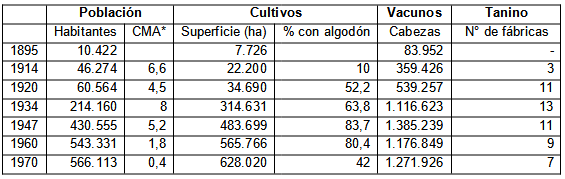 Al iniciarse el período provincial, las actividades productivas sobre las que se había sustentado la prosperidad del Chaco comenzaron a experimentar serias dificultades (Besil, 1969; Brodersohn, Slutzky y Valenzuela, 2009). La industria taninera se vio afectada tempranamente por recurrentes crisis de superproducción, que daban lugar al cierre de fábricas y al cese de la actividad de los obrajes. También la actividad algodonera entró en una fase de declinación, muy afectada por la caída de la demanda del mercado interno. La situación se agravó para los productores porque el gobierno nacional cesó de intervenir en el mercado algodonero. La comercialización quedó bajo el control de las grandes hilanderías, que regulaban en su beneficio el precio pagado a los agricultores. La crisis forestal y algodonera tuvo un fuerte impacto social y económico. Su manifestación más evidente fue el éxodo de la población rural hacia los centros urbanos de la provincia y de la Pampa Húmeda, por lo que el crecimiento demográfico de la provincia fue casi nulo entre 1960 y 1970.