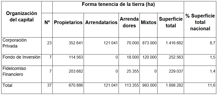 Este es el grupo predominante entre los capitales estudiados. Está conformado por 23 sociedades de capital, de las cuales nueve poseen 352.641 hectáreas en propiedad, siete controlan 121.041 hectáreas en arrendamiento, seis controlan 873.000 de forma mixta y un posee 70.000 como arrendador. En su estructura del capital, la totalidad son de origen privado, en su mayoría de composición cerrada (no cotizan en bolsa), y su territorialización es variable.