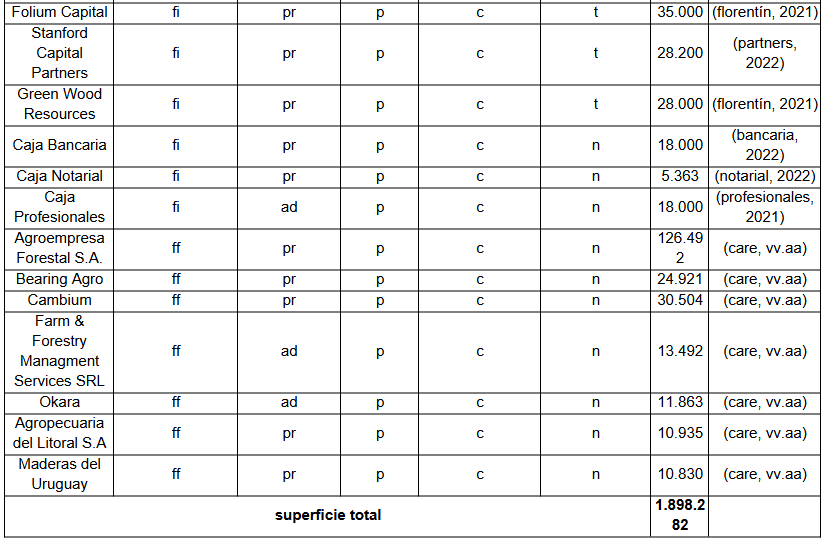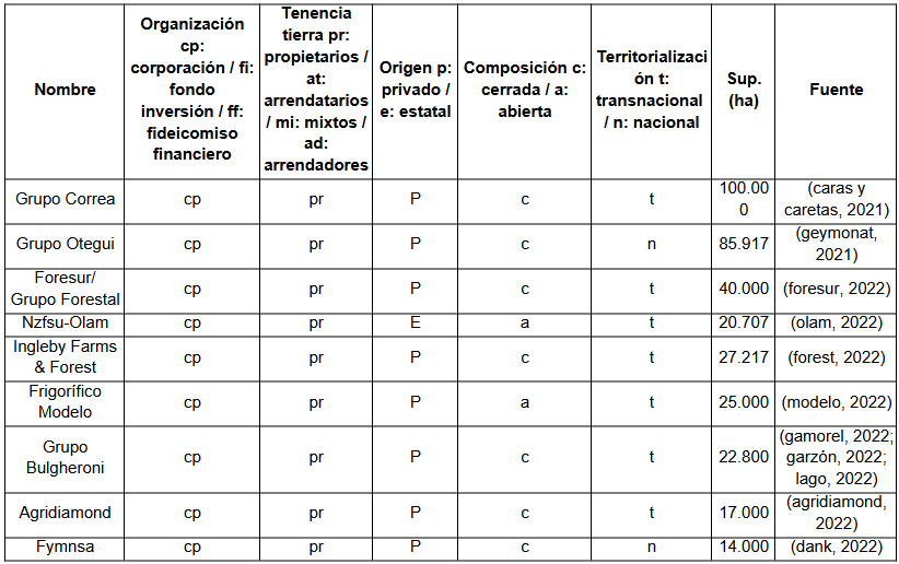 Entre los propietarios de mayor superficie se destacan las empresas de Ernesto Correa, de origen brasileño, radicado en Uruguay, con unas 100.000 hectáreas en varias empresas dedicadas fundamentalmente a la ganadería. El grupo además tiene inversiones en el sector cementero (Cielo Azul) y fue propietario del frigorífico PUL. Le sigue en importancia el grupo Otegui, uno de los principales grupos económicos uruguayos (Geymonat, 2021), con unas 85.000 hectáreas en el sector silvícola. También en el sector forestal se destaca Foresur - Grupo Forestal, una asociación de capitales uruguayos, integrada por la producción primaria e industrial y que controla unas 40.000 hectáreas.