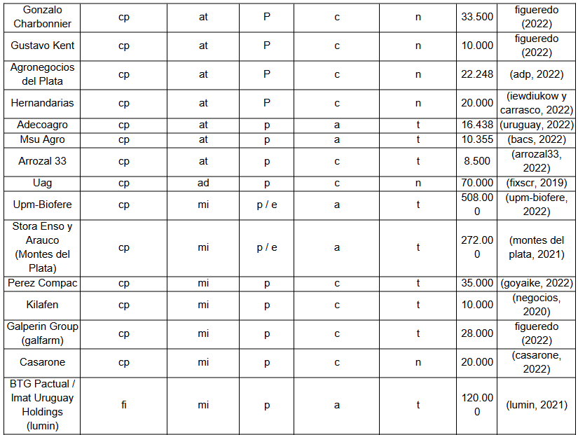 Estos tipos fueron analizados, a su vez, según cuatro atributos destacados por la bibliografía previa: (i) la tenencia de la tierra (propietarios puros, arrendatarios, arrendadores y mixtos); (ii) el origen del capital, según sea estatal (en propiedad o regulado directamente) o privado; (iii) la composición del capital, según sea abierto, cuando la empresa cotiza en bolsa, o cerrado cuando no lo hace; y (iv) la territorialización del capital, según sea de base nacional, cuando sólo opera en Uruguay (sea de capitales nacionales o extranjeros), o de base transnacional, cuando opera en Uruguay y en otros países en simultáneo. La síntesis de esta clasificación por capital se presenta en la Tabla 2 en Anexos.