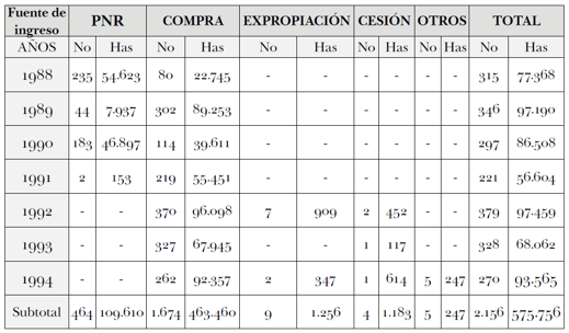 Las tierras que se lograron incorporar por parte del INCORA entre 1988 y 1994 fueron 2.156 predios para un total de 575.756 has, en su mayoría bajo compra directa (463.460 ha); por su parte el Plan Nacional de Rehabilitación logró la compra de 464 predios que suman un área de109.610 ha. La expropiación de tierras “por motivos de interés público y utilidad social”, cuyos procedimientos la ley 30 había hecho más expeditos, fue una modalidad poco utilizada (Centro Nacional de Memoria Histórica, 2016) dada la presión de los grandes terratenientes que se marcó desde el pacto de Chicoral (1972) y que se mantuvo a través del tiempo. Lo anterior se puede ver en la tabla 2.