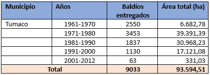 Con relación a la concentración de la tierra en la Costa Pacífica Nariñense podemos observar dos fenómenos que se presentaron a la par: 1. La sustracción de área de la ley 2 de 1959 (encargada de proteger las áreas de economía forestal y conservación de recursos naturales); 2. Titulación de baldíos. Los casos en los cuales, históricamente se adelantaron procesos de sustracción de área en Nariño, corresponden a las zonas donde, además de adelantar entrega de baldíos según las disposiciones de la Ley de Reforma Agraria (135 de 1961), se aplicó el artículo 3 de la Ley 2ª de 1959, por conocimiento de las determinaciones legales y el impulso del desarrollo del cultivo de palma africana en el país. Esto ocurrió en la Costa Pacífica Nariñense, específicamente en el Municipio de Tumaco. Los predios baldíos adjudicados en la zona de Tumaco desde 1961 a 2012 se presentan en la tabla 3.