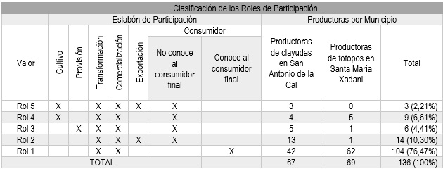 La Tabla 1 presenta los resultados derivados del mapeo y análisis de los roles de participación de las mujeres en la cadena de valor de maíz-tortilla. Inicialmente, se contabilizaron y clasificaron las mujeres productoras involucradas en cada eslabón. Posteriormente, se identificó su participación en función de los eslabones en los que participaban, utilizando los resultados obtenidos del mapeo de la cadena de valor del totopo en Santa María Xadani y de la clayuda en San Antonio de la Cal. Este análisis reveló cinco roles de participación, que fueron ponderados y transformados en una variable escalar con una puntuación que va de 1 a 5. El valor más alto se asignó al rol de participación con el mayor número de eslabones de la cadena de valor.