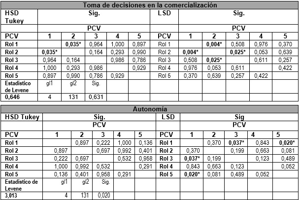 Con el fin de realizar las comparaciones adicionales para identificar específicamente qué rol de participación de las mujeres productoras en la cadena de valor de maíz- tortilla produce cambios en los dominios del empoderamiento de la mujer, se aplicaron las pruebas subsecuentes a la ANOVA- post hoc con el método de HSD Tukey (Prueba de la diferencia media significativa) y DMS (Diferencia mínima significativa), debido a que los grupos de comparación no son homogéneos (Núñez Colín, 2018). En la Tabla 4 se observan diferencias significativas entre los roles de participación 1, 3, 5 y el dominio de Autonomía del empoderamiento de la mujer. Asimismo, entre los roles de participación 1, 2, 3 y el dominio de Toma de decisiones en la comercialización del empoderamiento de la mujer.