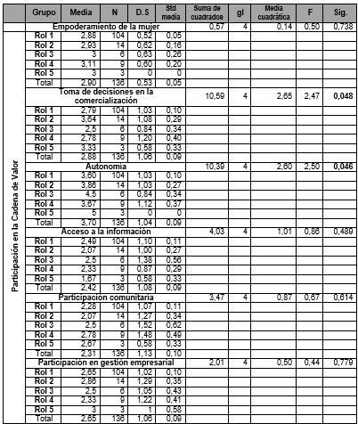 Para determinar las diferencias significativas entre las medias de los grupos, se aplicó la prueba de ANOVA (Análisis de Varianza). La Tabla 3 muestra los valores descriptivos obtenidos, como la media, la puntuación porcentual media y la desviación estándar del empoderamiento de la mujer en relación con los cinco roles de participación de las mujeres productoras. También se observan los niveles de significancia en las diferencias obtenidas entre las dimensiones del empoderamiento de las mujeres y los roles de participación de las productoras de totopo y clayuda. Con ellos se observa que los cambios significativos (p<,05) únicamente ocurren entre la dimensión de Toma de decisiones y la Participación en la cadena de valor (M2=2,65, p=0,048) y la Autonomía (M2=2,60, p=0,046).