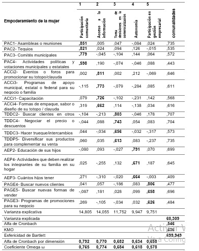 Basándonos en la revisión de la bibliografía, se identificaron las dimensiones del empoderamiento de la mujer, se definieron los indicadores y se desarrollaron las preguntas para adecuarlas al contexto específico de las productoras de clayuda y totopo en los municipios objeto de estudio. Para validar el instrumento de medición, se evaluó la fiabilidad de todas las preguntas utilizadas. Se llevó a cabo un análisis factorial exploratorio utilizando el método de análisis de componentes principales con rotación Varimax para validar la variable de empoderamiento de las mujeres. Se obtuvieron valores de Kaiser-Meyer-Olkin (KMO) de 0,636 y de esfericidad de Bartlett de 699,949 como medidas de validez del instrumento. Conforme a Alinovi et al (2010), el análisis factorial permite generar un índice compuesto de múltiples ítems utilizando técnicas de reducción de datos cuando varios indicadores están correlacionados, lo que proporciona un enfoque más sólido para capturar la interrelación entre variables y generalizar los resultados en comparación con los índices de un solo ítem.