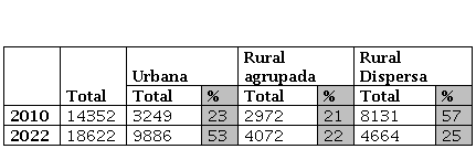 Estos procesos son acompañados por diversas políticas públicas (educativas, habitacionales, de salud, entre otras1) que promueven un modelo de producción del espacio concentrado en las áreas urbanas del departamento (INDEC, 2010 y 2022). Según datos de los censos 2010 y 2022 (Tabla 1), la población rural (agrupada y dispersa) se reduce de un 78% a un 47% en el período analizado, siendo la rural dispersa la más afectada (de 57% a 25%). La población rural agrupada se mantiene en valores porcentuales similares en el período analizado (de 21 a 22%). En contraparte, se observa un aumento de más del doble de la población urbana departamental, pasando del 23% al 53% del total.