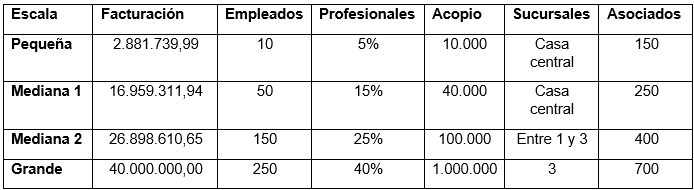 Para acceder a ese universo, optamos por un muestreo de tipo intencional y/o crítico. La clasificación de las cooperativas según su escala y complejidad organizativa nos parecen criterios relevantes en el marco del agronegocio, en el que la captación de mercados y la incorporación de saberes profesionales son claves para la competitividad empresarial. Para ello, recurrimos, por un lado, a la clasificación por tamaño que realiza el Ministerio de Agricultura, Ganadería y Pesca (MAGyP) de Argentina de las empresas agropecuarias y, por otro lado, la del Registro Único de la Cadena Agroalimentaria (RUCA) de los acopios de granos. A estos dos criterios le adicionamos variables específicas de las cooperativas como la cantidad de asociados y otras que nos parecen significativas porque inciden en su modelo organizativo como el número de profesionales en planta permanente y/o contratados. En función de ello, elaboramos la siguiente escala.