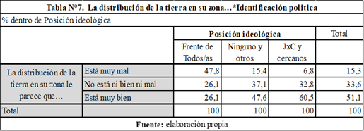 Por otra parte, en lo que respecta a la posición ideológica, se registra una mayor percepción de la concentración en las/os seguidoras/es del Frente de Todas/os (FdT), lo que resulta previsible en función de que el discurso peronista, dentro de las fuerzas políticas mayoritarias, fue el que históricamente cuestionó a las/os grandes terratenientes (Lattuada, 2002; Liaudat, 2023). Mientras el 26% de las/os seguidores del FdT identificó que la propiedad de la tierra la tienen unos pocos propietarios, solo el 7% de las/os seguidoras/es de JxC y cercanos escogió esa respuesta. Pero, aquí también es en la valoración al respecto donde la contraposición es aún más clara: casi el 48% de las/os seguidores del FdT señaló que la distribución de la tierra está muy mal, en tanto sólo el 7% de las/os votantes de JxC y cercanos optó por esta respuesta (Tabla N°7). También en la pregunta sobre las consecuencias de la producción se observa cierta influencia de lo ideológico. Si bien la concentración no es elegida en primer orden por ninguno de los grupos de votantes, lo que da cuenta de la invisibilización de dicha problemática aún entre quienes se identifican con el FdT, sí se observa una mayor presencia entre ellas/os (un 18% eligió esta opción) en relación a las/os votantes de la derecha (sólo un 2% escogió esta respuesta).