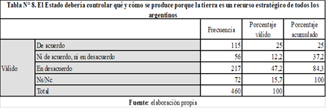 En este marco nos preguntamos cuál es la mirada de los actores agrarios de la principal región productiva del país sobre el rol del Estado en la regulación de la tierra. En primer lugar, para indagar en el peso de los discursos sobre este tema que circulan en la esfera pública, les presentamos en momentos diferentes de la encuesta dos frases típicas, de valencias opuestas, sobre el rol del Estado en relación a la regulación del uso de la tierra y les solicitamos que expresen su nivel de acuerdo para indagar en la consistencia de su posicionamiento. Por un lado, recurrimos a una frase asociada al discurso agrarista crítico (Balsa, 2017), promovido históricamente por la Federación Agraria, que planteaba El Estado debería controlar qué y cómo se produce porque la tierra es un recurso estratégico de todos los argentinos. Esta frase contó con muy bajo apoyo: casi la mitad de las/os encuestadas/os sostuvo que estaba en desacuerdo, aunque un cuarto de ellas/os expresó estar de acuerdo (Tabla N°8).