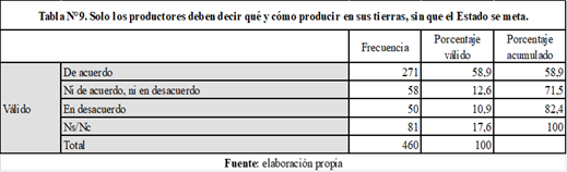 Por el otro lado, en otro momento de la encuesta, introdujimos una frase con un sentido contrario: Solo los productores deben decir qué y cómo producir en sus tierras, sin que el Estado se meta, propia del discurso liberal-conservador promovido históricamente por la entidad que representa a las/os grandes terratenientes pampeanos, la Sociedad Rural Argentina (Balsa, 2017). En este caso, encontramos un alto nivel de apoyo con casi un 60% de expresiones de acuerdo y sólo un 11 % de desacuerdo (Tabla N°9).