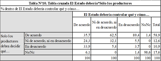 Asimismo, encontramos un importante nivel de coherencia en las respuestas de tipo liberal ya que casi el 90% de quienes manifestaron su desacuerdo con la frase anterior estuvieron de acuerdo con esta frase. Por el contrario, del 25% que estuvo de acuerdo con la intervención del Estado en la frase anterior las respuestas fueron más variadas en este caso, tal como se visualiza en la siguiente tabla cruzada (Tabla N°10).