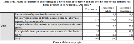 Frente a una pregunta que invitaba a ponerse en el lugar del presidente y decidir sobre cómo distribuir la tierra en Argentina, un 46% eligió la opción que señalaba que el Estado no debería intervenir porque el derecho a la propiedad de la tierra es sagrado y hay que respetarlo, pero casi un 36% eligió alternativas que planteaban diferentes niveles de intervención estatal para garantizar el acceso a la tierra y/o frenar la concentración. Nos referimos a comprar tierras y venderlas en cuotas a productores sin tierra propia (más del 16 %), sancionar leyes que frenen la concentración (11%) e incluso una opción más radicalizada, como expropiar tierra que no se usa para producir y distribuirla, que parecería estar muy ajena a los consensos ideológicos que el capitalismo ha logrado cosechar en las últimas décadas en nuestro país (Balsa, 2024), fue elegida por el 8% de los encuestados (Tabla N°11). De todos modos, se debe destacar que la opción de intervención más elegida (“comprar tierras…”) se basa en el total respeto de la propiedad privada, en sintonía con los sentidos liberales predominantes.