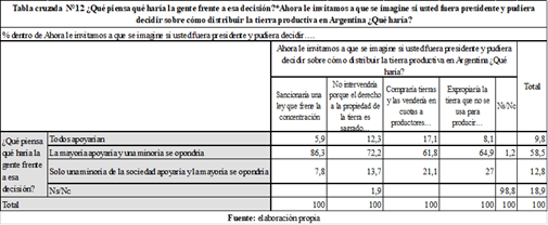 Además, los actores agrarios que eligieron opciones de intervención estatal consideraron que dichas políticas tendrían un importante nivel de apoyo en la sociedad. Particularmente, aquellas/os que escogieron la opción sancionaría una ley que frene la concentración, consideraron en su mayoría (más del 86%) que la gente los apoyaría (Tabla N°12)