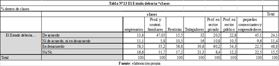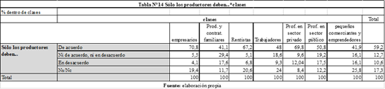 En cuarto lugar, nuevamente identificamos ciertas diferencias en las opiniones en función de la posición socioeconómica. Mientras que más del 45% de las/os productoras/es y contratistas familiares y de las/os pequeños comerciantes y emprendedoras/es, y el 32% de las/os trabajadoras/es estuvo de acuerdo con la frase que planteaba que el Estado debía intervenir, sólo alrededor del 15% de empresarias/os y rentistas manifestó su apoyo, adhiriendo en su mayoría a la respuesta que expresaba desacuerdo. (Tabla N°13). Asimismo, en la frase contraria, que plantea que sólo las/os productoras/es deben decidir qué hacer con la tierra, alrededor de siete de cada diez empresarias/os, rentistas y profesionales del sector privado sostuvo que estaba de acuerdo, mientras que en las otras clases las opiniones se encontraron más repartidas, aunque -valga aclarar- en un marco de acuerdo en general con esta idea (Tabla N°14).