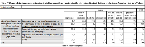 En el mismo sentido, en la pregunta sobre cómo intervendría si fuese presidente, la frase que planteaba que el Estado no debe intervenir tuvo mayor apoyo entre las/os empresarias/os (más del 51%), las/os profesionales en el sector privado (63%) y las/os rentistas (50%). Al mirar de conjunto las respuestas “intervencionistas” encontramos que las mismas tuvieron mayor relevancia entre las/os productoras/es y contratistas familiares (casi 53%), seguidos por las/os trabajadoras/es (casi 45%) y las/os profesionales del sector público (44%), que en esta respuesta y en la anterior se distanciaron de la mirada liberal de los profesionales del sector privado (Tabla N°15). Este grupo, compuesto por docentes de escuelas agrarias y rurales, y empleadas/os de organismos estatales, quienes trabajan usualmente con productoras/es familiares (o con sus hijas/os), a pesar de no identificar la concentración de la propiedad de la tierra (como vimos en las preguntas anteriores), probablemente estén visualizando problemas en la concentración del uso, y ello podría llevarlos a adherir a la necesidad de algún tipo de intervención estatal en el tema. Asimismo, se destaca que un cuarto de las/os pequeñas/os comerciantes y emprendedoras/es, quienes habían expresado una mirada bastante crítica sobre la concentración de la tierra, en esta pregunta respondió que no sabía o no quiso contestar, tal vez por no sentirse preparadas/os para opinar sobre el tema al no estar vinculados desde lo productivo con el sector agropecuario.