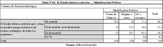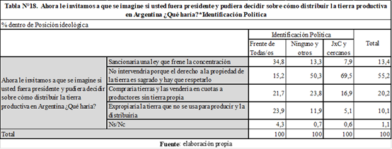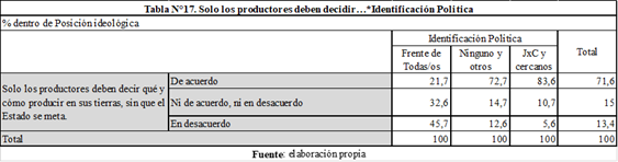 Por último, en quinto lugar, identificamos una fuerte influencia de la posición ideológica de los actores agrarios en sus opiniones sobre la intervención estatal. Mientras el 76% de las/os votantes del FdT estuvo de acuerdo con que el Estado debería controlar el uso de la tierra, sólo el 17% de las/os votantes de JxC y cercanos eligió esta opción (Tabla N°16). En el mismo sentido, en tanto el 84% de las/os votantes de la derecha estuvo de acuerdo con que sólo los productores deben decidir qué hacer con sus tierras, sólo el 22% de las/os seguidores del FdT eligió esta opción (Tabla N°17). Finalmente, en la pregunta sobre cómo intervendría si fuese presidente el 70% de las/os seguidoras/es de JxC y cercanos sostuvo que no intervendría, mientras sólo el 15% de los votantes del FdT escogió esa opción (Tabla N°18).