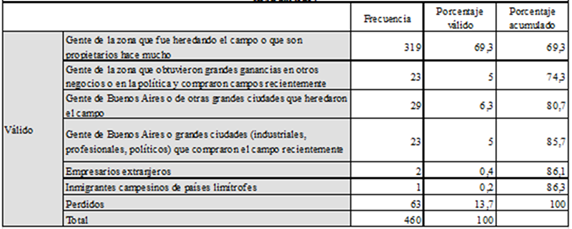 Por otra parte, vinculado a la idea de la concentración nos interesó conocer qué imagen tienen sobre quiénes son las/os terratenientes en la actualidad. Durante gran parte del siglo XX, con la lucha de chacareras/os y colonas/os, se instaló a nivel social una crítica muy fuerte a la figura de las/os grandes terratenientes como gente de las grandes ciudades desvinculada de las tareas productivas (Sábato, 1987). A su vez, en los últimos años, los representantes gremiales de las/os pequeñas/os y medianas/os productoras/es (particularmente, la Federación Agraria) incorporaron la denuncia de las/os nuevos compradores de tierra (empresarias/os de otros rubros, políticos) que aparecieron de la mano de la expansión de los agronegocios.