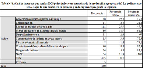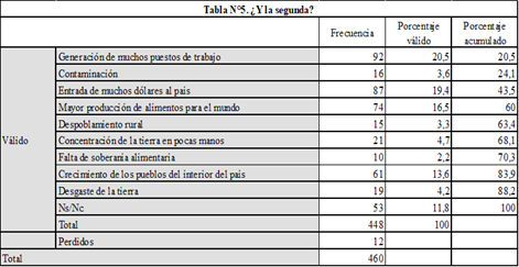 Finalmente, para intentar captar la importancia que los actores agrarios atribuyen a la concentración de la tierra, les preguntamos cuáles consideran que son las dos principales consecuencias de la producción agraria y les ofrecimos nueve opciones de respuesta de diferente valencia (positivas y negativas). Con más elementos, aún, podemos decir que los actores agrarios consultados no identificaron la concentración de la tierra como una problemática principal asociada al modo en que se produce en el agro. Menos de un 5% eligió la “concentración de la tierra en pocas manos” en primera y segunda instancia (Tabla N°4 y 5).