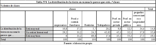 En relación a la clase, observamos que la concentración fue señalada en mayor medida por las/os productoras/es y contratistas familiares, las/os pequeñas/os comerciantes y emprendedoras/es ligados al sector y las/os trabajadores. En la pregunta sobre quién tiene la propiedad de la tierra en su zona más del 23% de las dos primeras categorías y casi un quinto de las/os trabajadoras/es dijo que “unos pocos propietarios que la concentran casi toda”, en clara contraposición a las/os empresarias/os productoras/es y rentistas, quienes prácticamente no escogieron esta opción (sólo el 6%y el 3% de ellas/os respectivamente lo hizo). Pero es principalmente en la pregunta que pedía una valoración respecto a la distribución de la tierra, donde se observa este contrapunto de miradas entre las diferentes posiciones socioeconómicas. Mientras que casi el 38% de contratistas y productoras/es familiares, cerca del 35% de las/os pequeñas/os comerciantes y emprendedoras/es, y más del 20% de las/os trabajadoras/es manuales dijeron que la distribución de la tierra estaba muy mal; menos del 6% de las/os rentistas, y un poco menos del 11% de las/os empresarias/os opinó de esta manera (Tabla N°6).