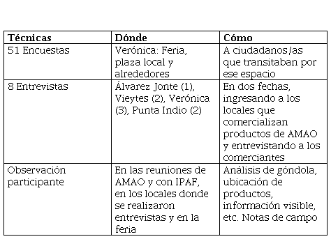 Además, se visitaron los locales comerciales de las ciudades de Álvarez Jonte,5 Vieytes,6 Punta Indio7 y Verónica, en los cuales se comercializan los productos de AMAO. En estas visitas, se realizaron entrevistas en profundidad a los comerciantes, intentando identificar mejor quiénes son los consumidores de AMAO, cuáles son sus principales características, porque eligen sus productos, etc. Por otro lado, se analizaron las góndolas, ubicación de los productos, cartelería, información disponible, entre otras variables (Tabla N° 1).