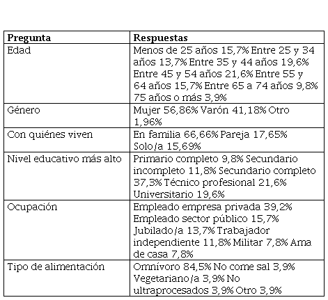 En primer lugar, para hacer una primera caracterización de la población encuestada (N=51), se preguntó sobre el género con el cual se identifican, con quiénes viven, edad, nivel educativo más alto, ocupación y tipo de alimentación (Tabla N° 2):