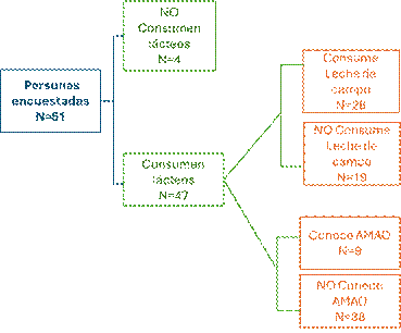 Luego de estas preguntas de caracterización, se realizaron otras que permitieron filtrar en diferentes categorías a las personas encuestadas, según si eran consumidores/as de lácteos o no, quiénes consumían leche de campo y quiénes de los productos de AMAO. Algunas preguntas eran comunes a todos, como las recién mencionadas, y otras eran específicas para cada uno de estos grupos.
