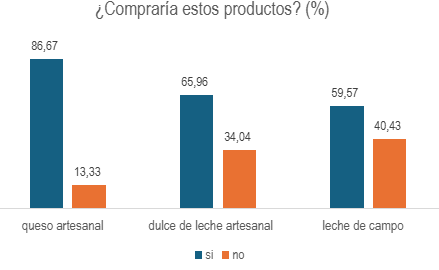 Luego, se les pidió a las personas encuestadas que dijeran cuáles de los tres productos compraría por precio, calidad y/o sabor (la respuesta era de opción múltiple). En los resultados se observa que el queso artesanal tuvo valoraciones positivas en las tres categorías, en cambio en el caso del dulce de leche el sabor y la confianza se destacaron positivamente, pero el precio tuvo valoración negativa, y, en el caso de la leche de campo, el precio y sabor se valoraron positivamente, pero no así la confianza.
