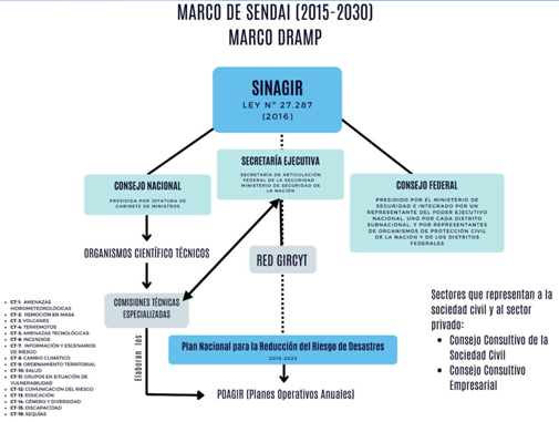 El surgimiento del SINAGIR marcó un punto de inflexión en la GIRD a nivel nacional, al proporcionar un marco normativo y operativo que consolidó el proceso de tecnificación en este campo. Desde sus inicios, el Sistema se articuló con ámbitos científico-técnicos preexistentes como la Red GIRCyT y su creación supuso una innovación tanto por las redefiniciones conceptuales que introdujo como por su estructura organizativa. La ley 27.287, que lo instituyó, concibe la GIRD como un proceso continuo, multidimensional, interministerial y sistémico de formulación e implementación de políticas orientadas a reducir la ocurrencia y el impacto de los desastres. Esta reformulación dialoga con enfoques teóricos que entienden a los últimos como procesos socioambientales internos a las sociedades de larga duración y lenta evolución (Arrién, 2022). A su vez, el SINAGIR se inserta en la trama de marcos internacionales como el Marco de Sendai5 [5] y el DRAMP en materia de sequías, que privilegian la proactividad frente a la reactividad en la gestión del riesgo.