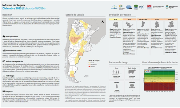 La segunda cuestión se refiere al proceso de tecnificación particular del área de Emergencia Agropecuaria a nivel nacional, el cual permitió consolidar una base de datos para el monitoreo de eventos hidrometeorológicos extremos, entre ellos las sequías. Un avance posterior fue la incorporación de diseñadores gráficos al equipo, quienes tradujeron la información científico-técnica en representaciones visuales de lectura intuitiva (como el formato semáforo presente en los Informes de Sequía), facilitando así su comprensión por parte de un público más amplio (M. de Estrada, comunicación personal, 4 de septiembre de 2023).
