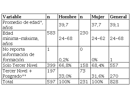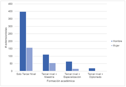 De los 828 extensionistas encuestados, 597 (72,1%) fueron hombres y 231 (27,9%) mujeres con una edad promedio para ambos de 39.7 años, siendo el porcentaje de hombres y la edad promedio similar a otros estudios en Ecuador (Landini y Bianqui, 2014; Landini y Villafuerte-Almeida, 2022) y otros países latinoamericanos (Landini, 2016; Santos et al., 2021; Monsalvo et al., 2017; Landini, 2013). La menor cantidad de mujeres extensionistas posiblemente se deba a menores oportunidades, o a la creencia que algunas labores u ocupaciones son concretas para hombres y no para mujeres (Pachano-Zurita y Molina-Torres, 2022), especialmente en el campo agropecuario. Estos resultados evidencian la necesidad de incorporar mecanismos específicos a las políticas de contratación de extensionistas en Ecuador que favorezcan un mayor equilibrio de género. Esto es importante, ya que se han descrito aportes específicos de las mujeres extensionistas, como mayor facilidad de ingresar al seno familiar, lo que abre mayores oportunidades no solo productivas, organizacionales y comerciales, sino también en los ámbitos de salud, ambiental, educación y de violencia de género (Esquisabel, 2018; Lahai et al., 1999; Ofuoku, 2012).