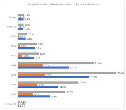 El rango de edad entre 31 a 40 años de edad tanto para hombres como para mujeres es el de mayor frecuencia en el Proyecto PIATER con el 45.9% de los encuestados. Al comparar estos datos con estudios reportados en México se observan diferencias, Mayoral et al. (2015) reportan el 30% y Santos et al. (2021) el 33.3% en el rango de 31 a 40 años, contrastando con datos del altiplano de Zacatecas (México), donde fue del 48% para el mismo rango (Galindo González et al., 2006). Estas diferencias se pueden explicar por la variación en períodos pasados de la cantidad de extensionistas que el MAG reclutó siendo mayor hace 10 o 15 años ralentizándose con posterioridad.
