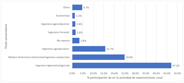 En la Figura 4 se muestra la distribución de la formación académica de los encuestados. En total se reportaron 13 áreas de conocimiento, 6 de las cuales representan casi el 90%, con un predominio de las disciplinas agrícolas y pecuarias por sobre otras marginales como las ciencias económicas o sociales. Al contrastar con los hallazgos de estudios a nivel latinoamericano se encuentran diferencias en la distribución en cuanto a las disciplinas agrícolas y pecuarias, sin embargo, se halla un predominio de estas disciplinas productivistas por sobre otras (Monsalvo et al., 2017; Santos et al., 2021; Landini, 2013). Probablemente, las diferencias encontradas entre las referencias consultadas se deban a la existencia de perfiles y potencialidades productivas diferentes en cada país y territorio que se traducen en distintas prioridades de los programas de extensión en cuanto a la distribución de perfiles profesionales específicos.