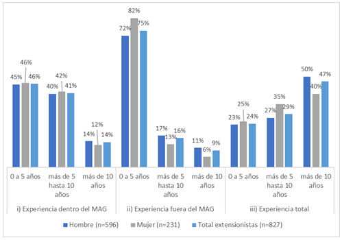 La distribución porcentual de frecuencias entre tres rangos de años de experiencia, diferenciando el género y agrupadas en i) experiencia dentro del MAG, ii) experiencia fuera del MAG y iii) experiencia total, se muestra en la figura 5. Es así como el 53% de los extensionistas encuestados tienen una experiencia total entre 0 a 10 años, mientras que aquellos con más de 10 años representan el 47%, similar a los datos presentados por Landini (2013) en Argentina con el 58 y 42%, respectivamente. Al analizar esta distribución de la experiencia total por género se encontraron diferencias siendo el 60% de las mujeres encuestadas que acumulan una experiencia total hasta de 10 años versus el 50% de hombres encuestados.