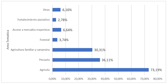 En la Figura 6 se detallan las frecuencias en términos porcentuales de las áreas de desempeño de los extensionistas, predominando las áreas agrícola, pecuaria y agricultura familiar y campesina con el 73,2%, 36,1% y 30,3% respectivamente, cuyas diferencias se pueden explicar por la formación académica de los extensionistas encuestados (ver Figura 4).