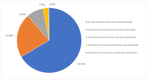 En la Figura 7 se muestra la distribución de frecuencias en cuanto al número de áreas temáticas en los cuales se desempeñan los extensionistas. Es así como el 66,5% de los extensionistas desarrollan una sola área temática, incluyendo el ámbito agrícola (38,0%), pecuario (23,0%) en tanto que solo el 2,8% indicó trabajar únicamente con Agricultura Familiar Campesina (AFC), posiblemente por tratarse de un área de integración. Por otro lado, el 22,0% desempeña actividades en dos áreas temáticas siendo la mayor la combinación de agrícola-AFC con un 13,9% del total. La combinación de tres, cuatro y cinco áreas temáticas corresponde respectivamente al 8,4%, 2,7% y 0,4% del total, siendo siempre la combinación agrícola, pecuaria y AFC las predominantes. Estos resultados difieren a los reportados por Landini (2013) que indicó en Argentina una distribución del 23,1% para el área agrícola, 42,0% para el área agropecuaria (agrícola y pecuaria) y 2,4% para el área forestal. No obstante, es necesario destacar que la tipificación de áreas en aquel trabajo no fue la misma que aquí, ya que no se consideró a la AFC como un área independiente y no se abrió la posibilidad de indicar varias áreas a la vez.