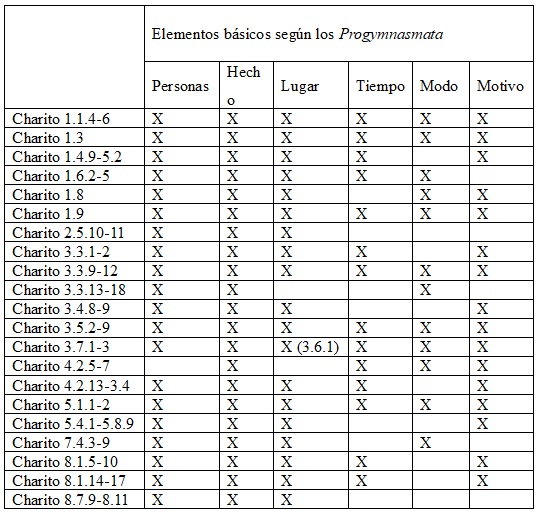 En el cuadro del anexo puede comprobarse que en la mayoría de los relatos de Calírroe se especifican todos sus elementos constitutivos (στοιχεῖα) y, en los casos en que no aparecen todos, sí que se mencionan los más importantes para hacer el relato claro y verosímil.