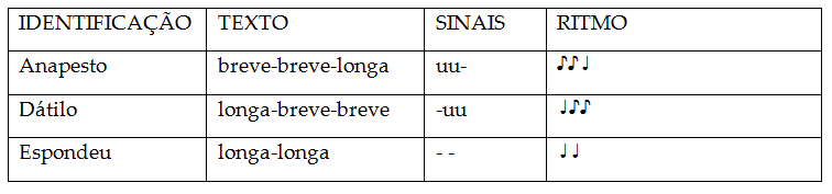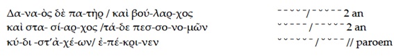 A regularidade dos sistemas anapésticos é duplicada nas dipodias ou agrupamentos métricos. Como se pode ver na escansão abaixo, cada verso se divide em duas subfrases métricas, as quais portam o mesmo padrão métrico. Por isso, cada verso vem marcado como “2 an”. Ora se a unidade mínima do anapesto é uma base longa-breve-breve (–uu) e cada parte ou subfrase possui duas bases ou duas dipodias, temos assim que o dímetro anaspéstico explora essa tensão entre a regularidade do metro e suas possíveis variações, que no seguir da performance, são micro e significativas variações.