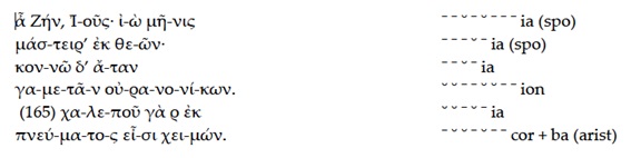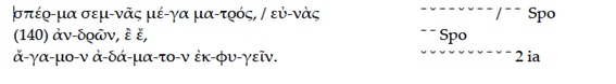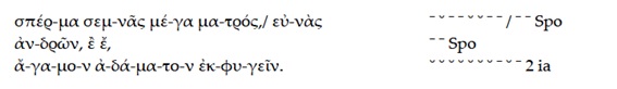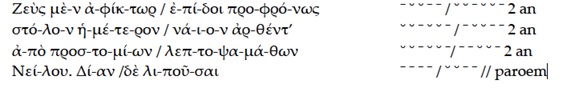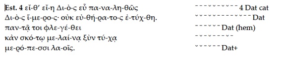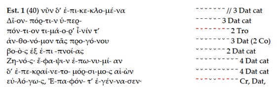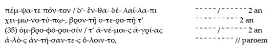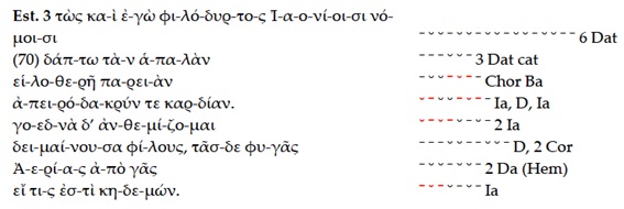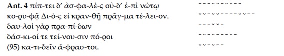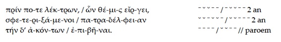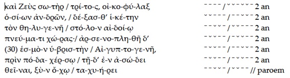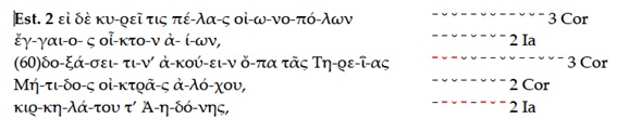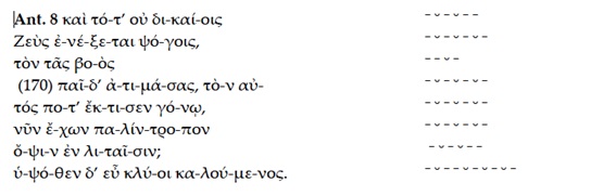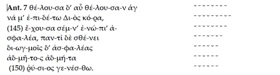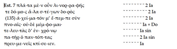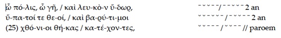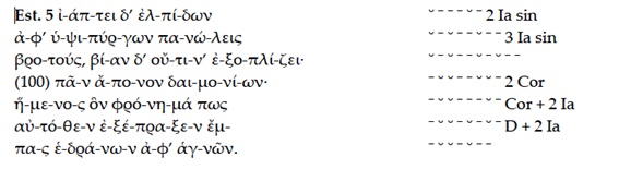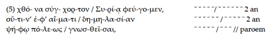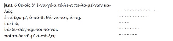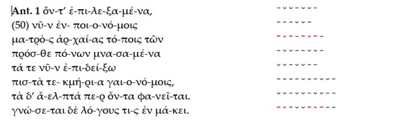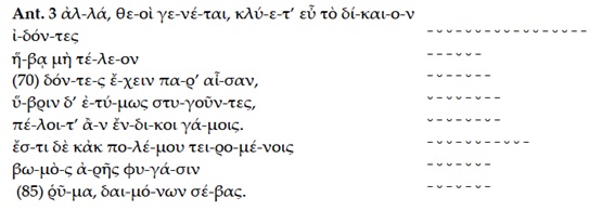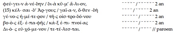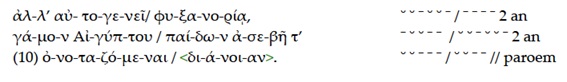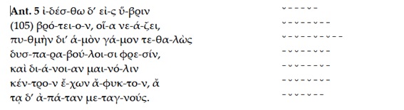 Como se pode observar, o recurso a padrões facilmente perceptíveis e recorrentes não exclui variações e, disto, referências mais sutis. Além das isoformas do dátilo, temos outra estratégia que redefine a regularidade dos anapestos: temos a inserção de paremíacos, ou formas cataléticas do dímetro anapestos, como fechamento ou cláusula de subseções no párodo. Ou seja, temos dímetros anapestos interrompidos, para os quais falta alguma sílaba ou posição métrica que atualizaria o padrão em sua completude. Na escansão que se segue abaixo podemos ver este efeito que rompe com a expectativa de preenchimento de todas as posições métricas nos versos 4, 7, 10, 13, 18, 22, 25, 32, 36, 39.
