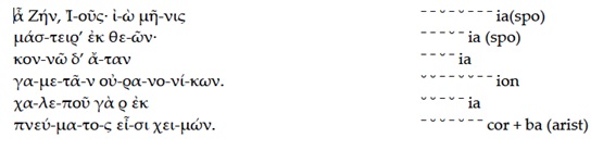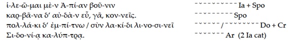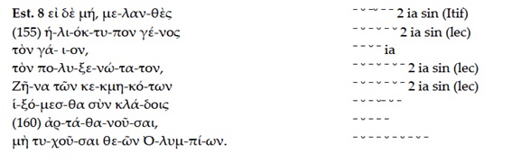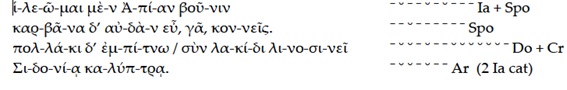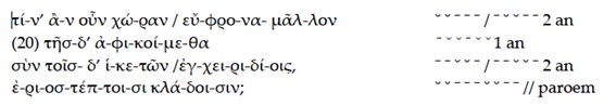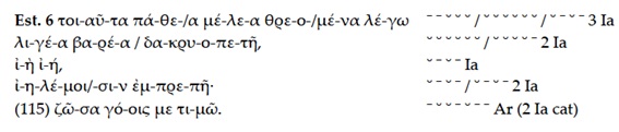 Este ritmo geral, em suas ondas de reiteração e interrupção, ultrapassa a fronteira linguística e textual do verso pode melhor ser apreendido quando aplicamos a ele algumas consequências do conceito de epiploké ou continuidade rítmica.5 O conceito é uma resposta a um problema comum em estudos rítmicos na versificação grega antiga: quando há ambivalência na interpretação dos registros métricos, temos muitas vezes posições ou metra em comum, as quais demonstram a prevalência do fluxo ou sucessão de unidades/ posições métricas. Assim, pela sequências trocaicas (base –u) muitas vezes se confundem com sequências iâmbicas (base u–), ou, como com em nosso caso, anapestos (uu–) com dátilos(–uu). Com isso, modulações rítmicas por padrões métricos assemelhados se constituem em uma chave para compreensão de modulações rítmicas em contextos heterométricos.