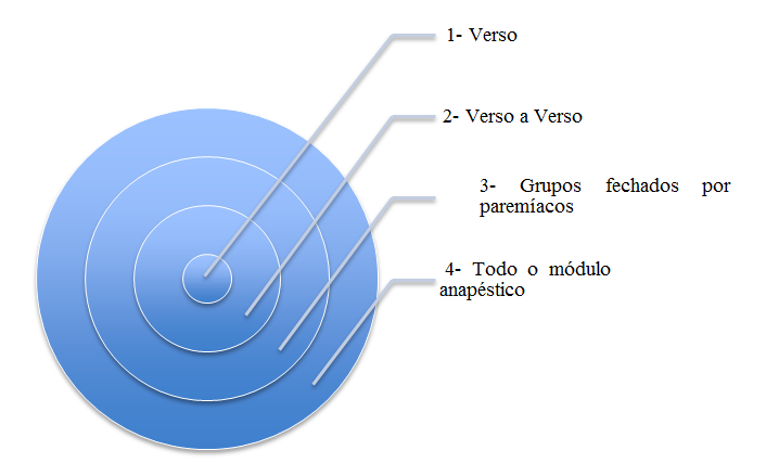 A imagem acima procura traduzir a correlação simultânea de diversas lógicas rítmicas que rumam em direção oposta à da desintegração analítica da escansão. No lugar de buscar referências cada vez menores, temos, pela correlação entre métrica e performance, a opção por soluções mais integrativas, que inserem as formas encontradas em níveis superiores de organização.