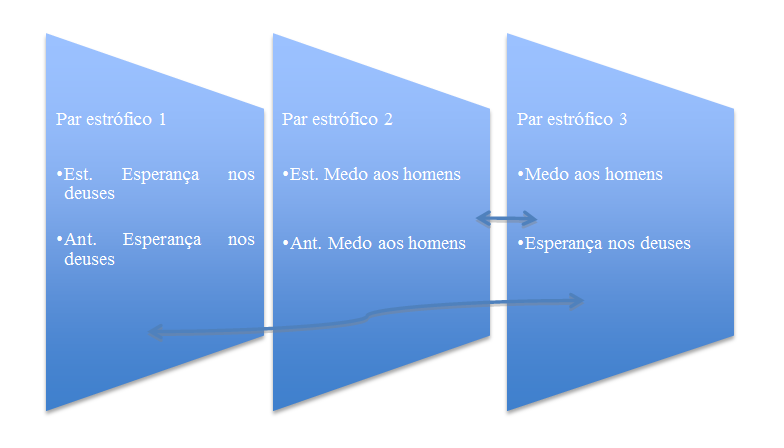 Sob um arco rítmico, temos as variações locais. A expectativa desse arco rítmico é construída a partir da tensão entre respostas emocionais contraditórias. E essas emoções contraditórias opõem não apenas pares estróficos entre si: como se vê no par estrófico 3, a estrofe alinha-se ao par estrófico 1, e a antiestrofe ao par estrófico 2.