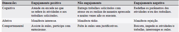 Apesar de se admitir a existência de uma realidade universitária na qual os estudantes nem sempre estão engajados positivamente em todas as dimensões explicitadas na tabela acima, convém salientar, no entanto, que para que o engajamento acadêmico efetivo ocorra é preciso que seja positivo em todas as dimensões (cognitiva, afetiva e comportamental). Não se pode afirmar que um estudante está realmente engajado se, apesar de mostrar-se participativo nas aulas e manifestar interesse pelos saberes discutidos, não realizar as atividades solicitadas e/ou faltar às aulas sem justificativas.