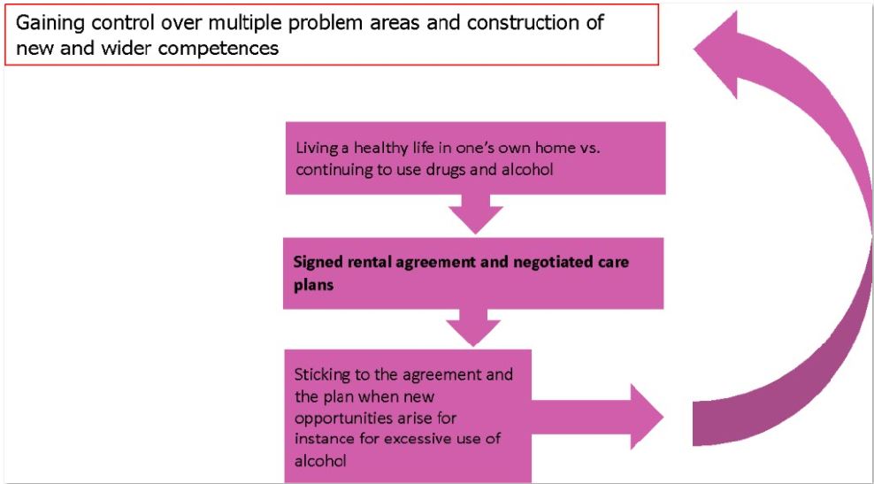 The clients are torn between living a healthy life in the apartment rented to them vs. continuing to use drugs and alcohol, for instance. The signed rental agreement and negotiated care plans serve as mediators and supporting agency formation anchors, what Vygotsky called “second stimuli.” Their existence and renewal play a key role when new problems arise for instance in the form of excessive use of alcohol. These are not rare occasions. Clients who move to apartments in housing units often know each other and when old acquaintances meet, old patterns tend to repeat ( PYYVAARA & TIMONEN, 2017).