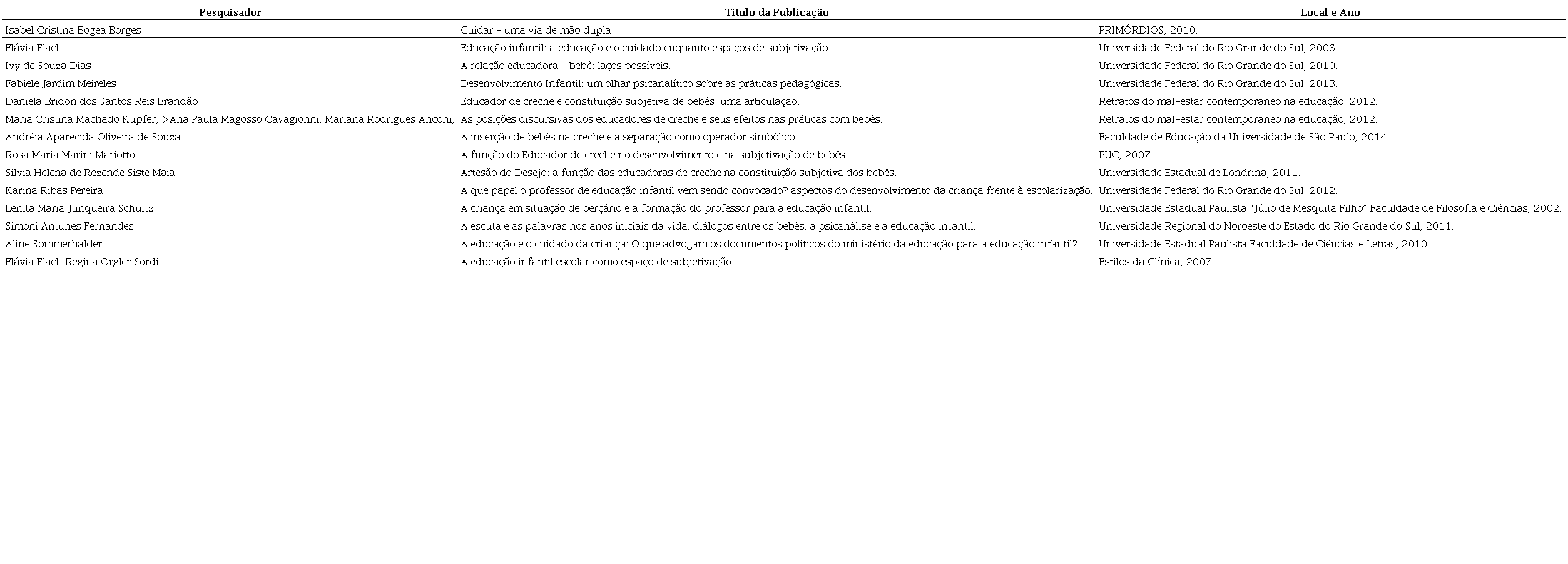 O material foi selecionado a partir da leitura dos títulos e resumos em língua portuguesa. Os critérios para a inclusão do material de análise foram os estudos que abordavam em seus resumos: espaço educacional creche/berçário que atendessem crianças até três anos de idade e declaração de aproximação aos conceitos psicanalíticos. Desse modo, excluíram-se artigos de outras perspectivas teóricas ou que não apresentaram uma posição teórica definida; também os estudos que não enfocaram o trabalho com crianças de zero a três anos; trabalhos que não fossem em espaço educacional e/ou que abordaram a escola e/ou educação de forma mais ampla, sem definir a série escolar. Considerou-se que as publicações psicanalíticas nem sempre estão indexadas nos bancos de periódicos utilizados neste trabalho, pois há muitas publicações que estão restritas nas escolas ou núcleos de formação em Psicanálise. Considerando essa possibilidade, optou-se por observar as referencias citadas nos artigos encontrados e, incluir, se fosse o caso, algum outro estudo que se enquadrasse nos critérios de busca e que não fosse encontrado nos bancos de dados. Ao total foram encontradas duzentas e quinze publicações e divididas em categorias. É importante ressaltar que títulos se repetiram nas bases de dados e, por isso, foram excluídos. Sendo assim, restaram quarenta e quatro publicações que não se repetiram. Entretanto, trinta publicações foram excluídas porque não corresponderam aos critérios de inclusão dessa pesquisa. Ao final, foram selecionadas para análise quatorze publicações, entre artigos, teses e dissertações, no período entre 2002 a 2016 (ver Quadro 1).